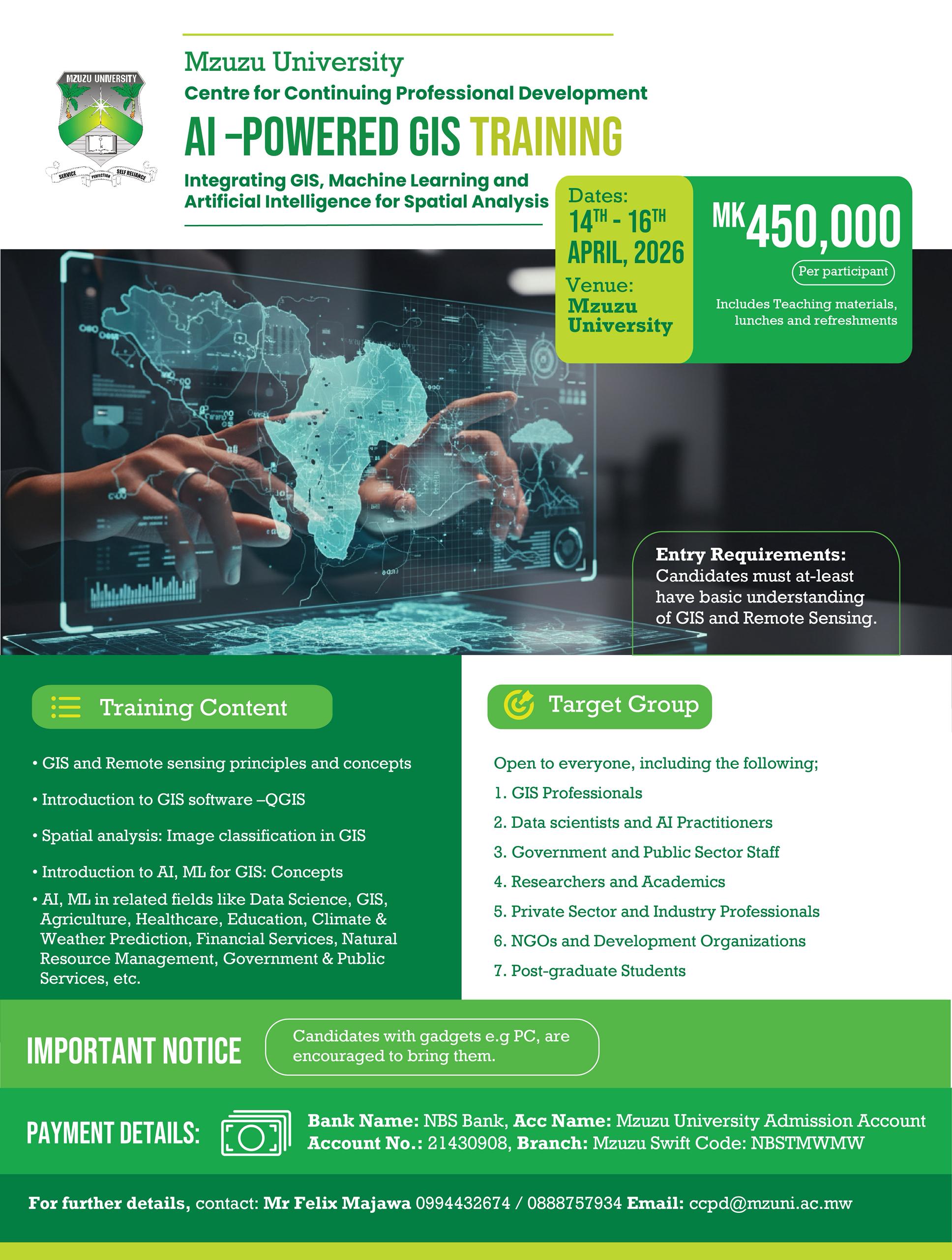 Mzuzu University, through the Centre for Continuing Professional Development (CCPD), invites applications for an AI-Powered GIS Training scheduled to take place from 14th to 16th April 2026 at Mzuzu University.