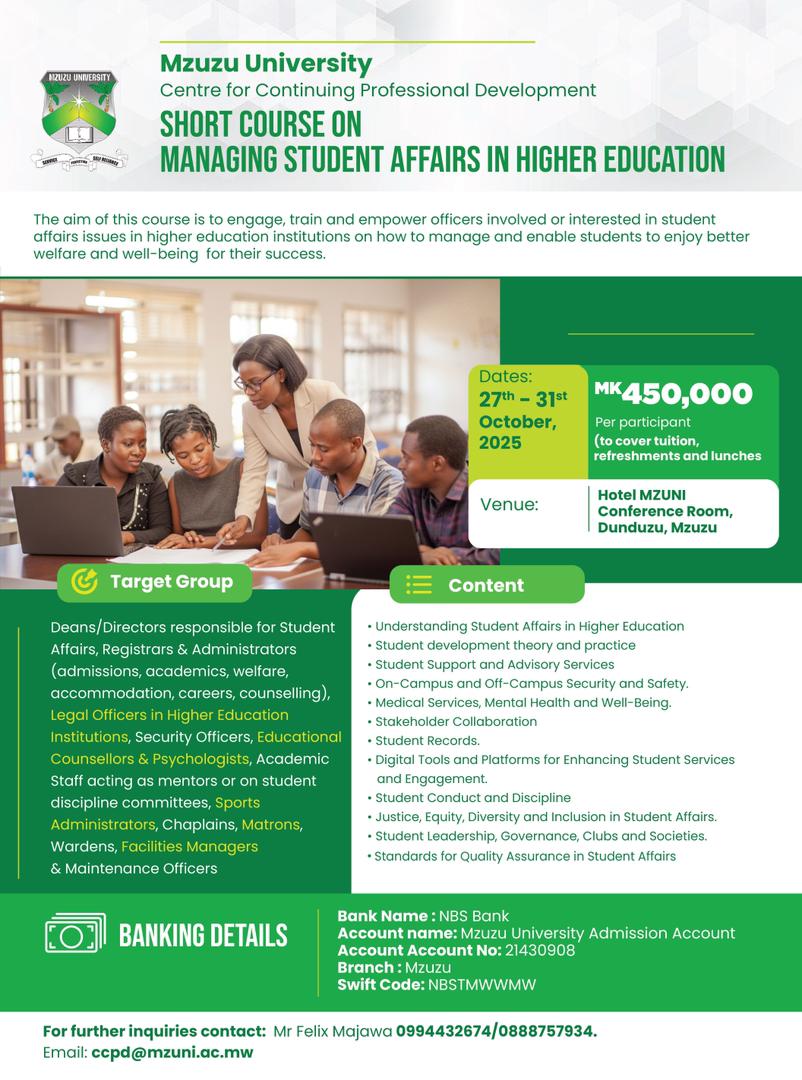 Mzuzu University, through the Centre for Continuing Professional Development (CCPD), is offering a five-day short course designed to engage, train, and empower officers involved in student affairs. The programme will cover student development, welfare, safety, support services, records management, and quality assurance in higher education. The training will take place at Hotel MZUNI Conference Room, Dunduzu, Mzuzu, from 27th–31st October 2025.