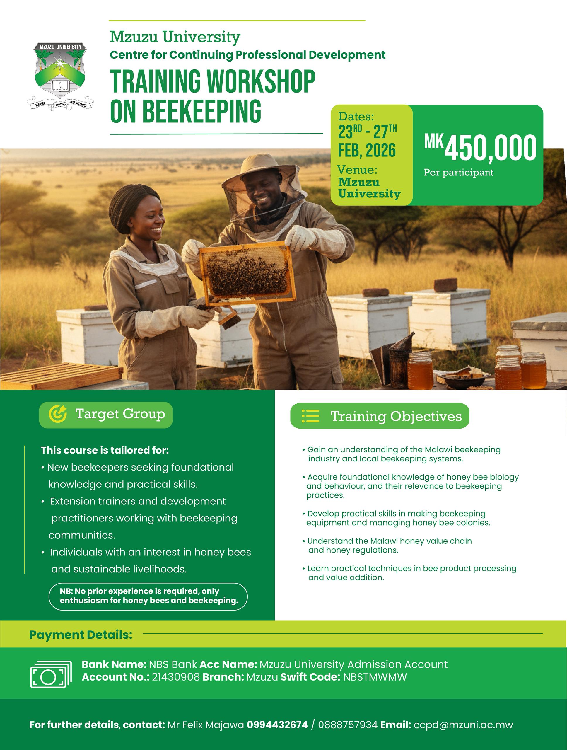 Mzuzu University, through the Centre for Continuing Professional Development (CCPD), invites interested participants to a Training Workshop on Beekeeping scheduled to take place from 23rd to 27th February, 2026 at Mzuzu University.